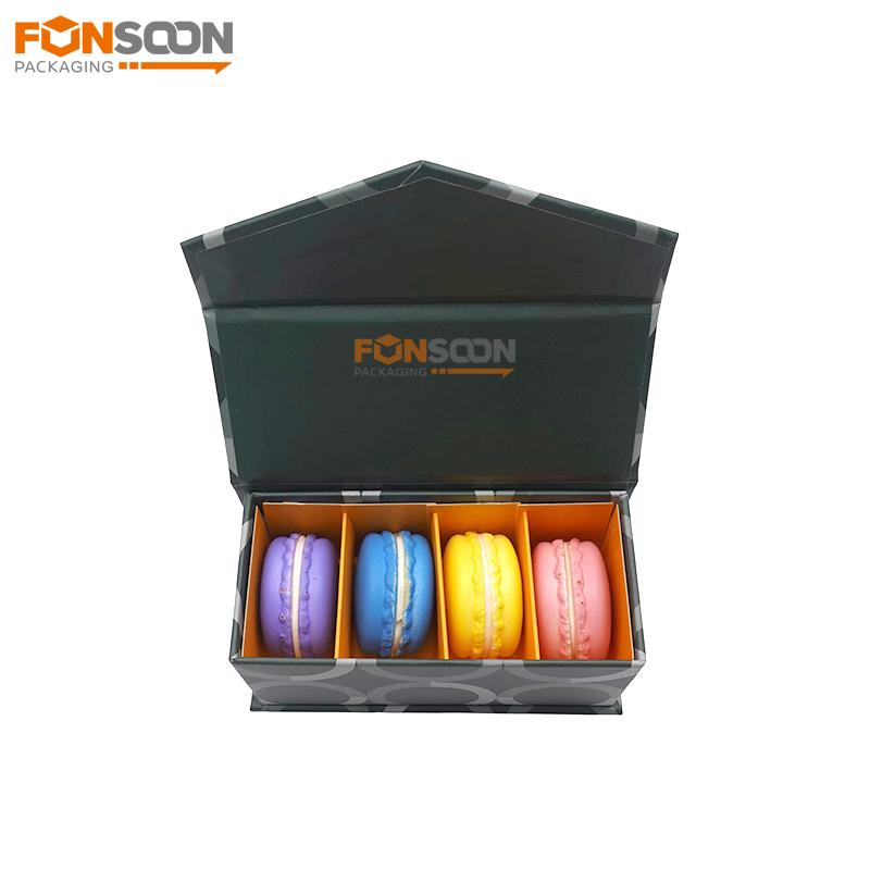 Boîte cadeau en carton rigide à 4 compartiments pour biscuits et desserts, avec couvercle à fermeture magnétique, idéale pour les macarons et autres biscuits. |