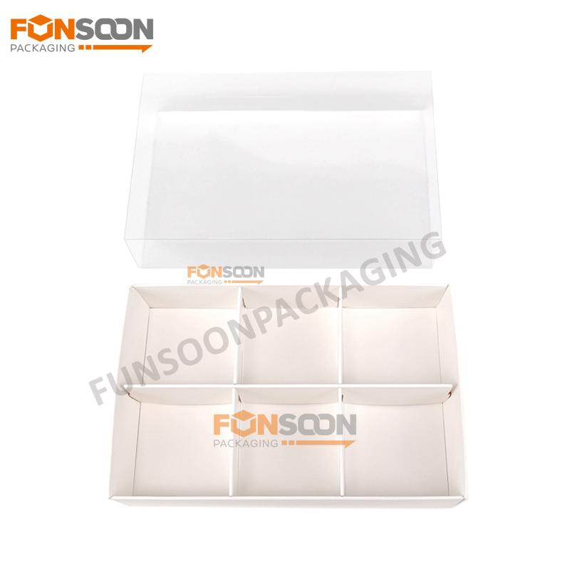 Le boîtes à dessert en papier Contient un tiroir coulissant extérieur, une boîte pliante en papier et des grilles de séparation en papier et une pochette en plastique PET transparent pour la fenêtre. La taille de la cavité de l'insert en papier est de 52 mm ** 52 * 34 mm de hauteur, si la taille de votre biscuit macaron est plus petite que cela fonctionnera parfaitement.