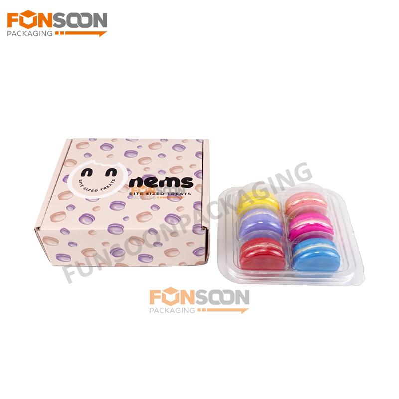 Cette prime boîte en carton ondulé Fabriquée en carton ondulé E-Flute de haute qualité, cette boîte d'expédition plate se plie facilement pour un gain de place lors du stockage et du transport. Le kit comprend des alvéoles en PET transparent servant de barquettes et une coque extérieure rigide. Notre boîte est dotée de lignes de découpe précises pour un assemblage impeccable. Vous pouvez personnaliser vos macarons à l'intérieur comme à l'extérieur grâce à une impression Pantone. À l'intérieur, des barquettes en PET de qualité alimentaire de 0,55 mm se ferment hermétiquement (type couvercle et fond) pour protéger chaque bonbon dans son alvéole (45 mm de diamètre × 29 mm de largeur), préservant ainsi la fraîcheur et l'intégrité des macarons pendant le transport. Cette configuration est idéale pour les anniversaires, les fêtes ou les commandes en boutique. Réputées pour leur robustesse, leur empilabilité et leur durabilité, les boîtes d'expédition en carton ondulé font bonne impression et marquent votre marque dès le premier contact. Forts de plus de 12 ans d'expérience dans l'exportation d'emballages de desserts vers les marchés européen et nord-américain, nous proposons une personnalisation complète et des échantillons gratuits pour garantir un ajustement et une finition parfaits.