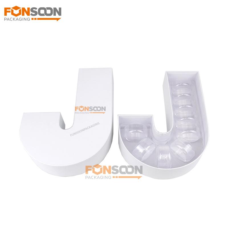 Coffret cadeau de luxe en forme de J pour macarons, avec insert en plastique et impression personnalisée. |